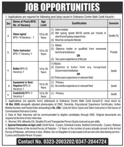 Advertisement of Pak Army Ordnance Centre Malir Cantt Karachi Jobs 2026 for Stenotypist, Tailor, Cook & Others-296126