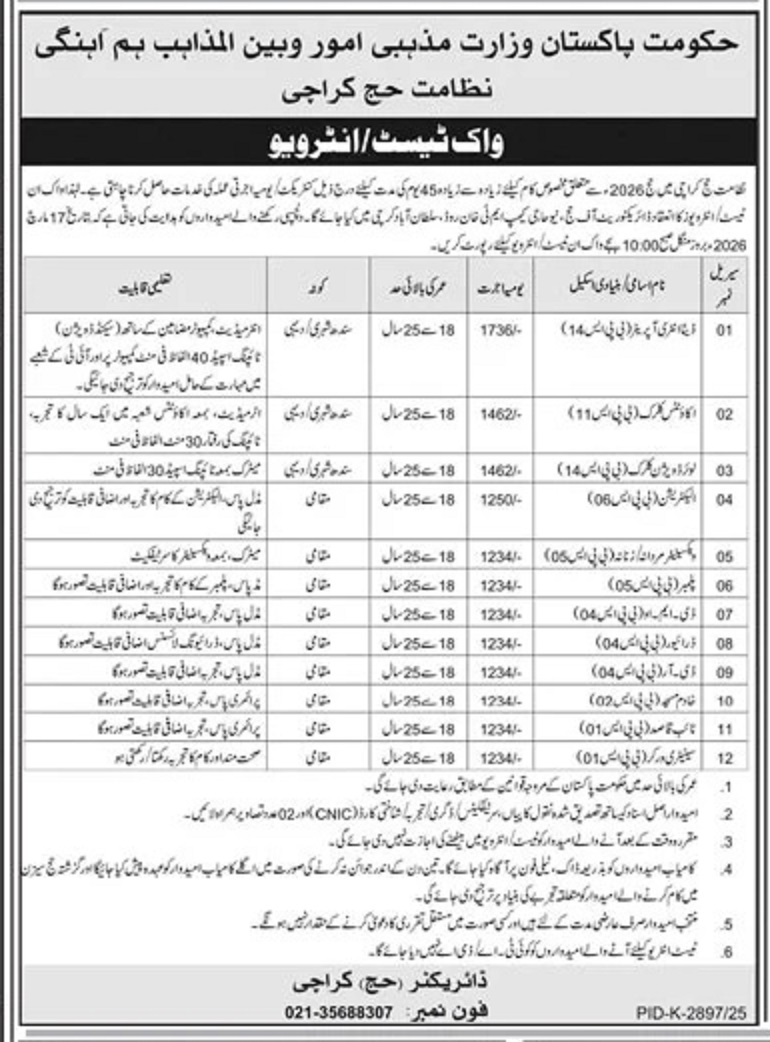 Advertisement of Directorate of Hajj Karachi Jobs 2026 for Clerks, Data Entry Operator, Naib Qasid & Others Ministry of Religious Affairs Latest-296128
