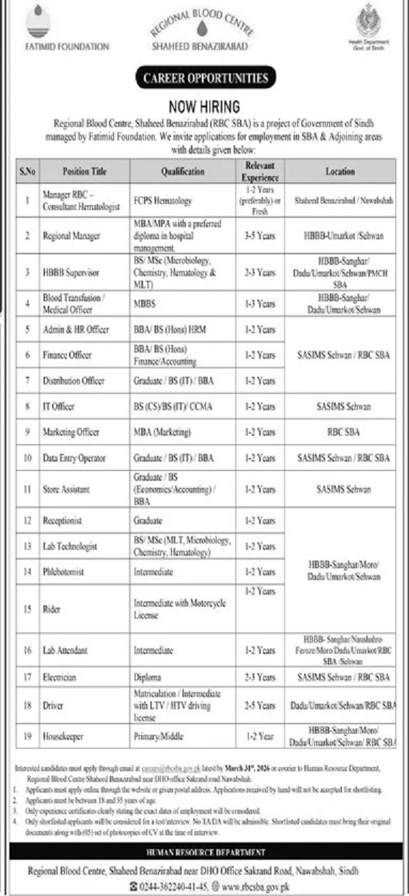 Regional Blood Centre Shaheed Benazirabad Jobs 2026 for IT Officer, Data Entry Operator & Others Fatimid Foundation Latest Job Ad shown on this page is taken from Jang Newspaper on 01-03-2026