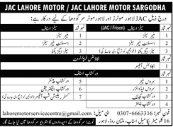 Advertisement of JAC Lahore Motor Jobs 2026 for Managers Assistant Managers, Sales Executives & Others in Lahore & Sargodha-296135