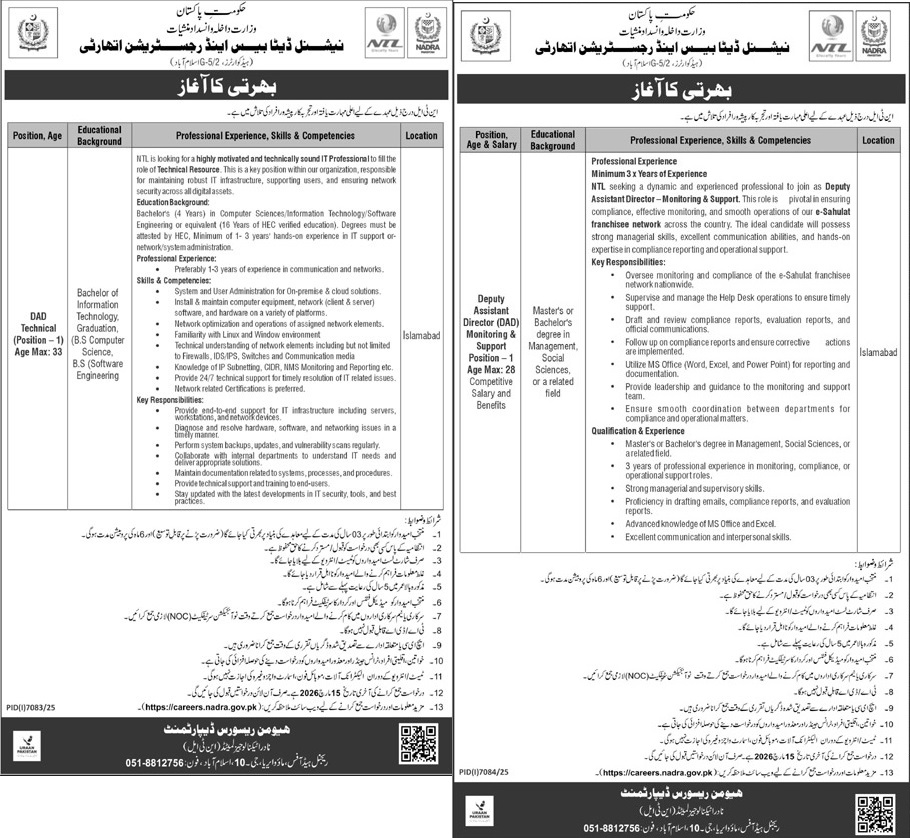 Advertisement of NADRA Technology Limited NTL Jobs 2026 Apply Online for Deputy Assistant Directors-296141