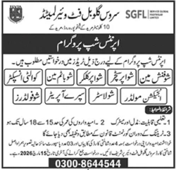 Service Global Footwear Limited SGFL Apprenticeship Program Jobs 2026 Job Ad shown on this page is taken from Jang Newspaper on 03-03-2026