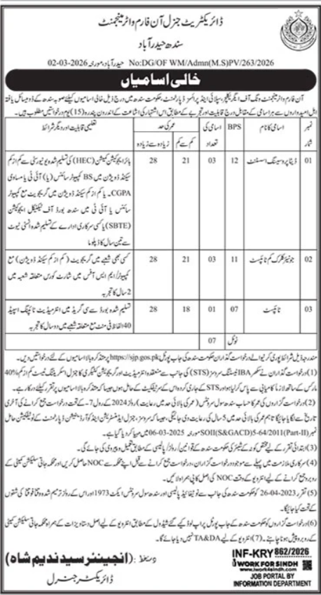 Directorate General On-Farm Water Management Sindh Jobs 2026 Apply Online Job Ad shown on this page is taken from Jang Newspaper on 04-03-2026