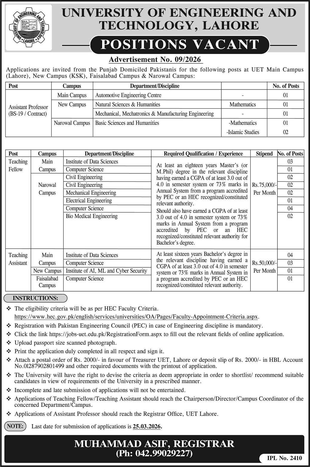 Advertisement of UET Lahore Jobs 2026 for Teaching Assistants, Teaching Fellows & Assistant Professors Apply Online-296183