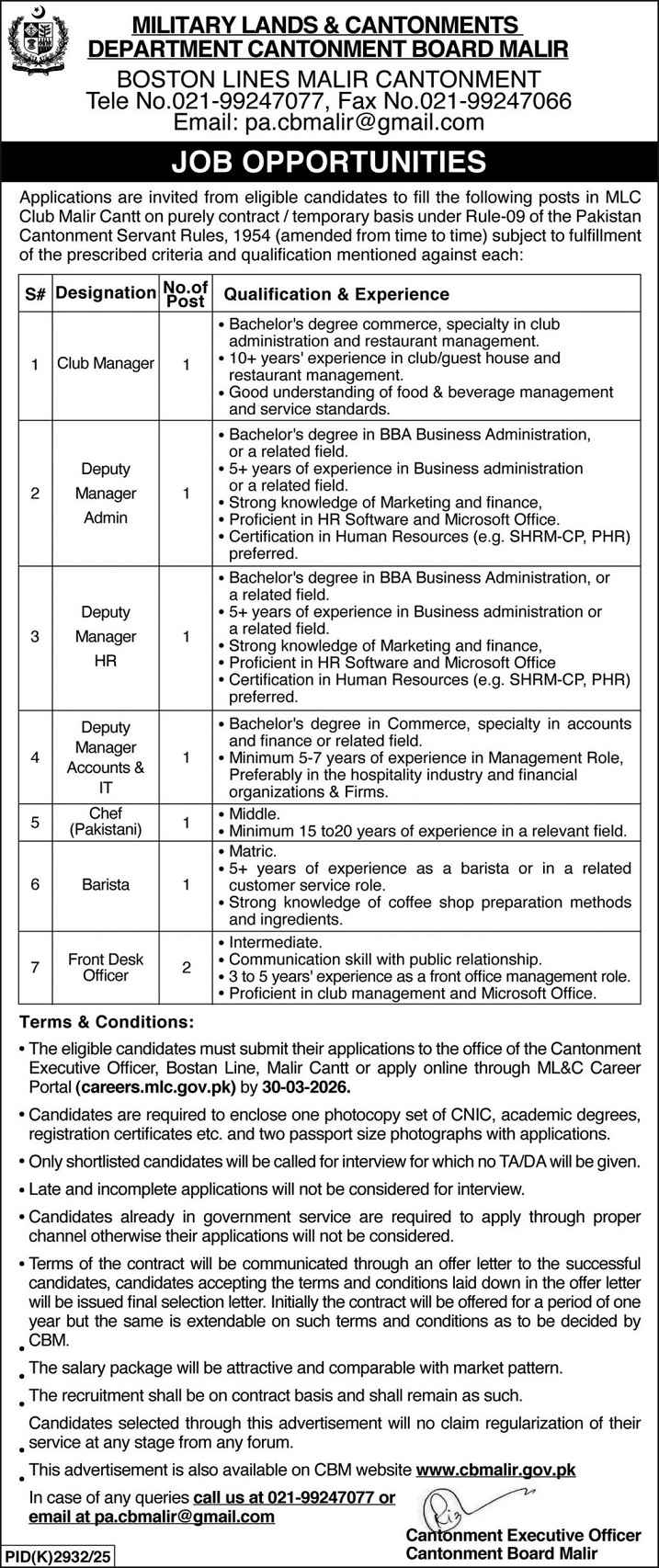 Military Lands & Cantonments Department Jobs 2026 Apply Online for Managers, Front Desk Officers & Others Job Ad shown on this page is taken from Express Newspaper on 07-03-2026