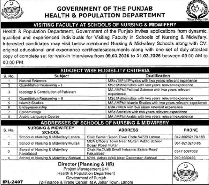 Advertisement of Health & Population Department Punjab Jobs 2026 for Visiting Faculty Walk-In Interviews-296198