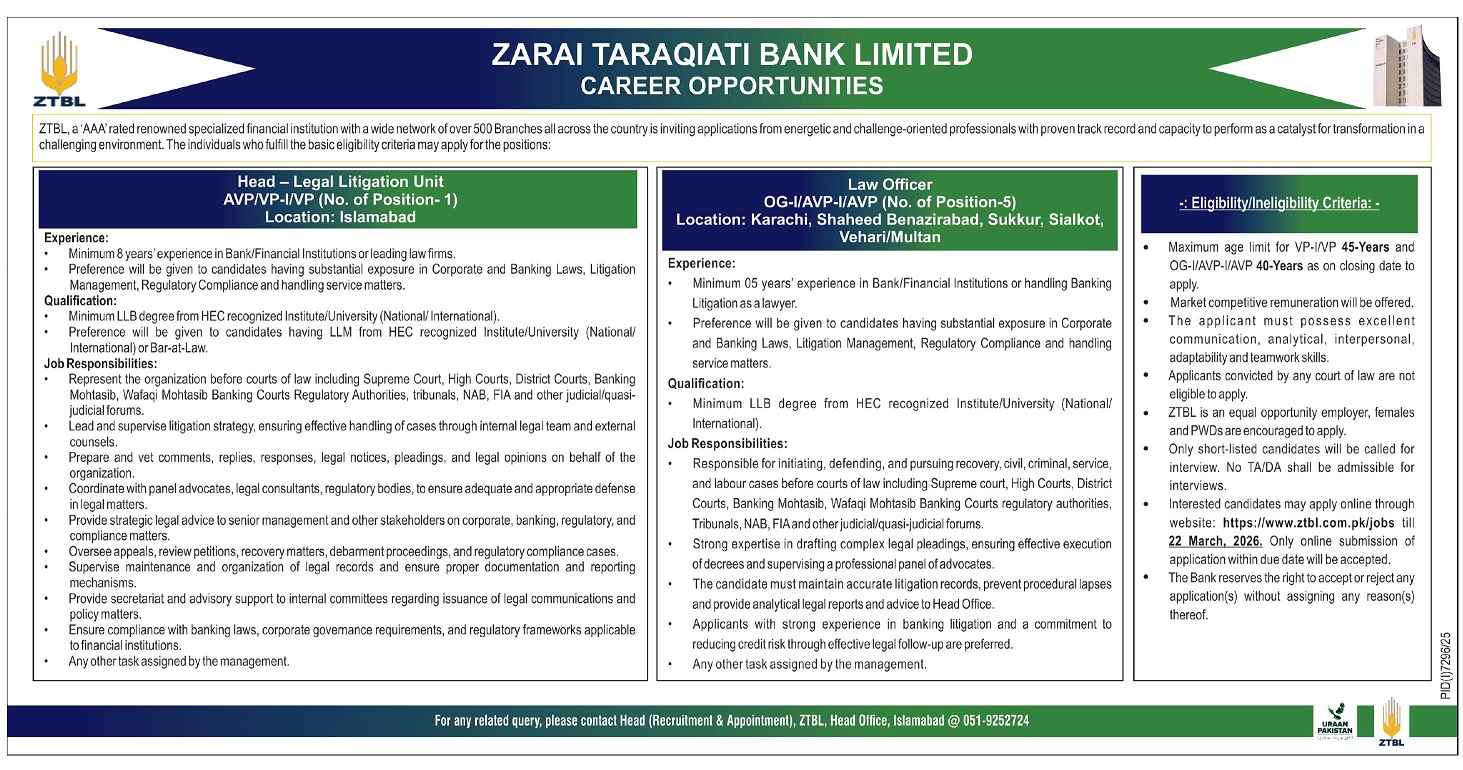 Advertisement of ZTBL Jobs 2026 Apply Online Zarai Taraqiati Bank Limited Career Opportunities-296222