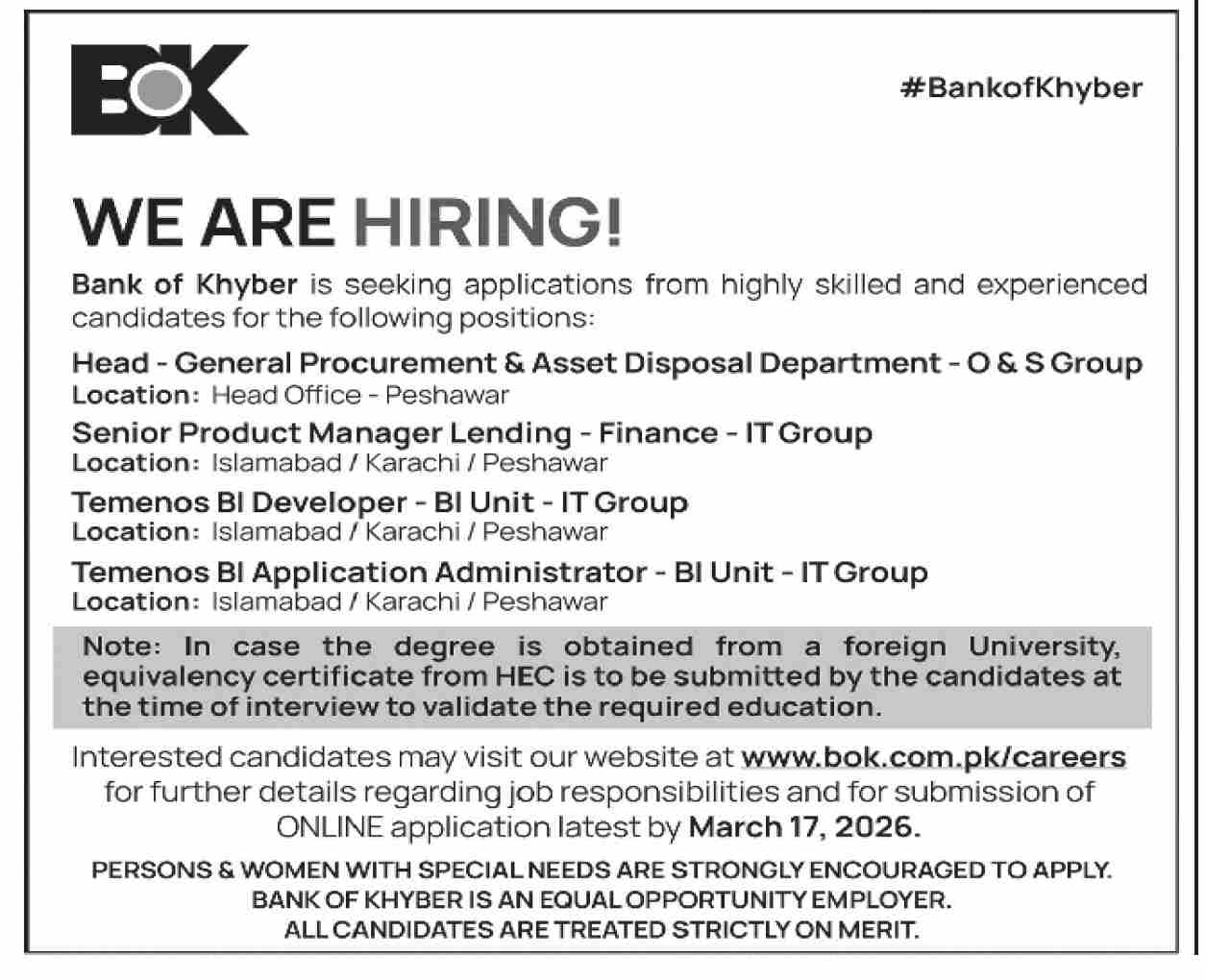 Bank of Khyber BOK Jobs 2026 Apply Online for Peshawar, Islamabad & Karachi Job Ad shown on this page is taken from Dawn Newspaper on 11-03-2026