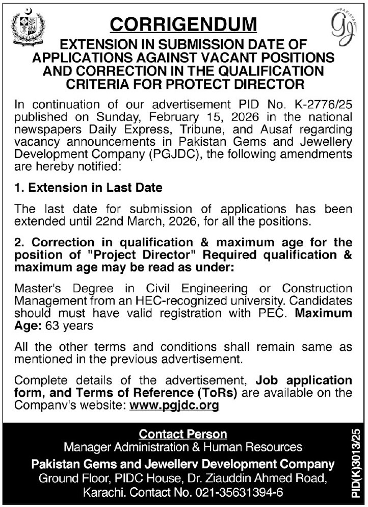 Advertisement of Pakistan Gems and Jewellery Development Company PGJDC Jobs 2026 for Engineers, Surveyors & Others-296273