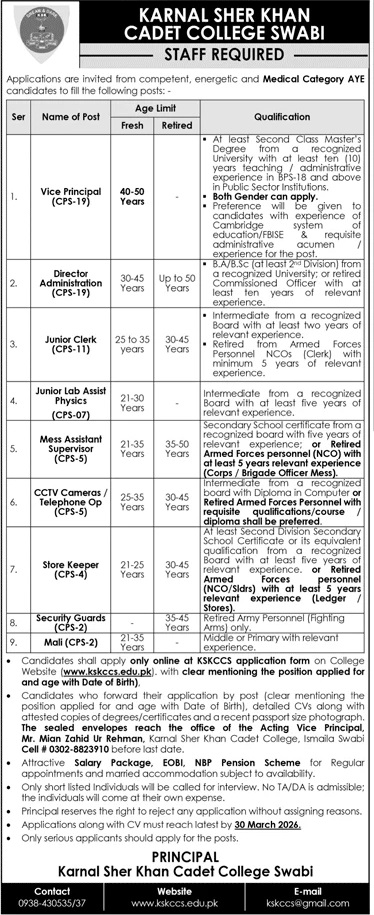 Karnal Sher Khan Cadet College Swabi Jobs 2026 Apply Online Clerk, Lab Assistant, Store Keeper & Others Latest Job Ad shown on this page is taken from Jang Newspaper on 15-03-2026