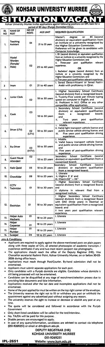 Advertisement of Kohsar University Murree Jobs 2026 for Teaching Assistants, Chowkidar, Naib Qasid & Others Latest-296295