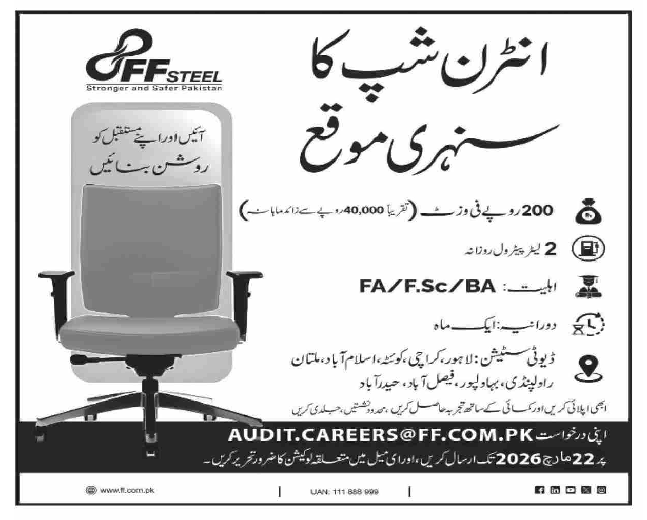 Advertisement of FF Steel Internship Program 2026 for Lahore, Karachi, Quetta, Islamabad, Multan, Rawalpindi, Bahawalpur, Faisalabad & Hyderabad-296297