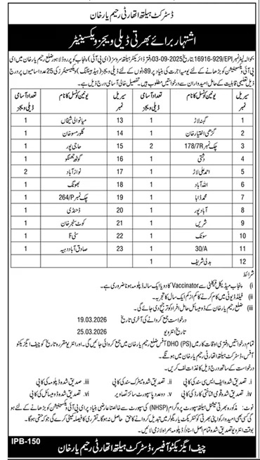 Advertisement of District Health Authority Rahim Yar Khan Jobs 2026 for Vaccinators Punjab Health Department-296300