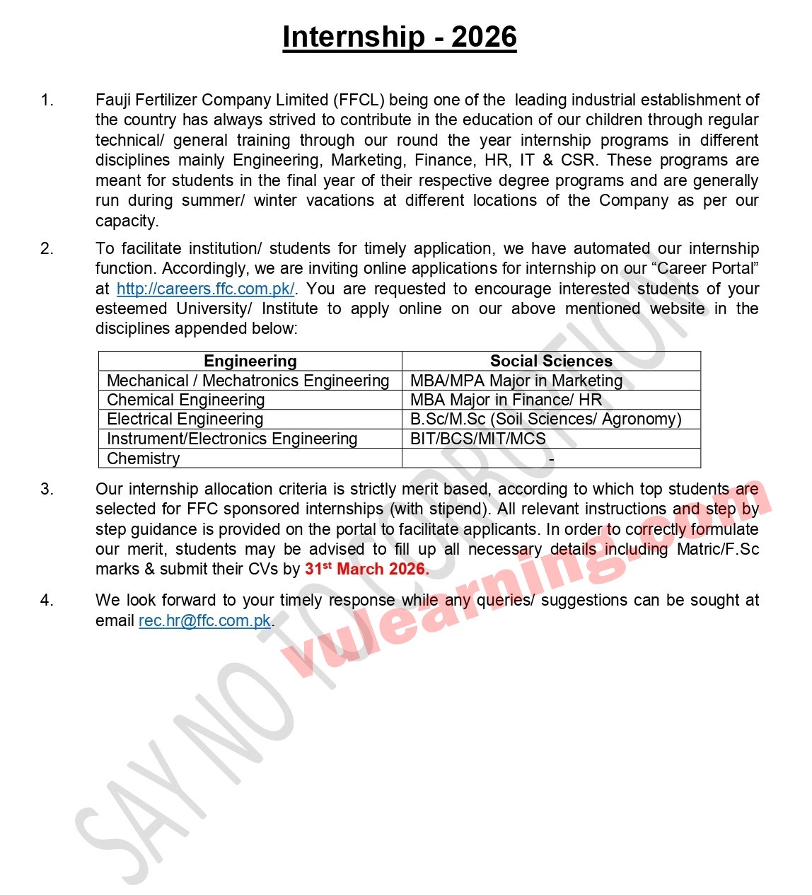Fauji Fertilizer Company FFC Internship Program 2026 Apply Online Job Ad shown on this page is taken from Not in Newspaper Newspaper on 15-03-2026