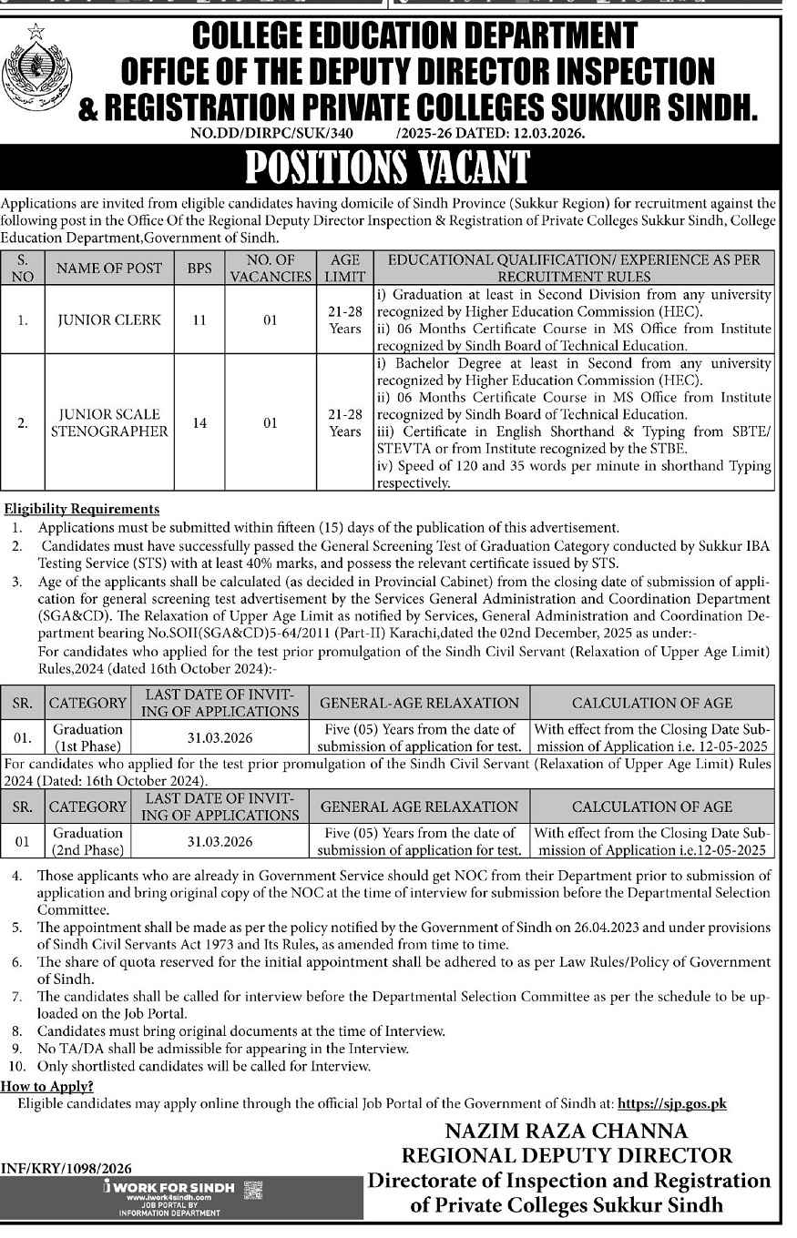 College Education Department Sukkur Jobs 2026 Apply Online for Jr Clerk & Jr Stenographer Job Ad shown on this page is taken from Express Newspaper on 17-03-2026