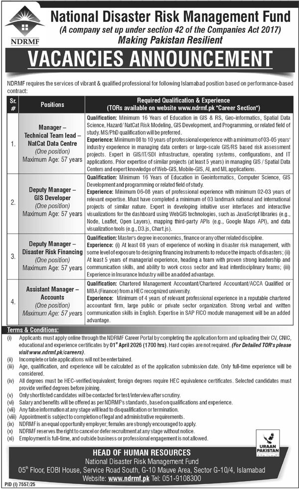 National Disaster Risk Management Fund NDRMF Jobs 2026 for Assistant Managers, Deputy Managers & Manager Apply Online Job Ad shown on this page is taken from Express Newspaper on 18-03-2026