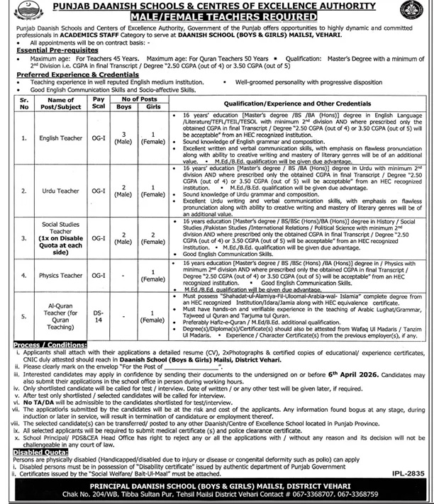 Advertisement of Daanish School Mailsi Jobs 2026 for Male & Female Teachers Punjab Daanish Schools and Centers of Excellence Authority-296353