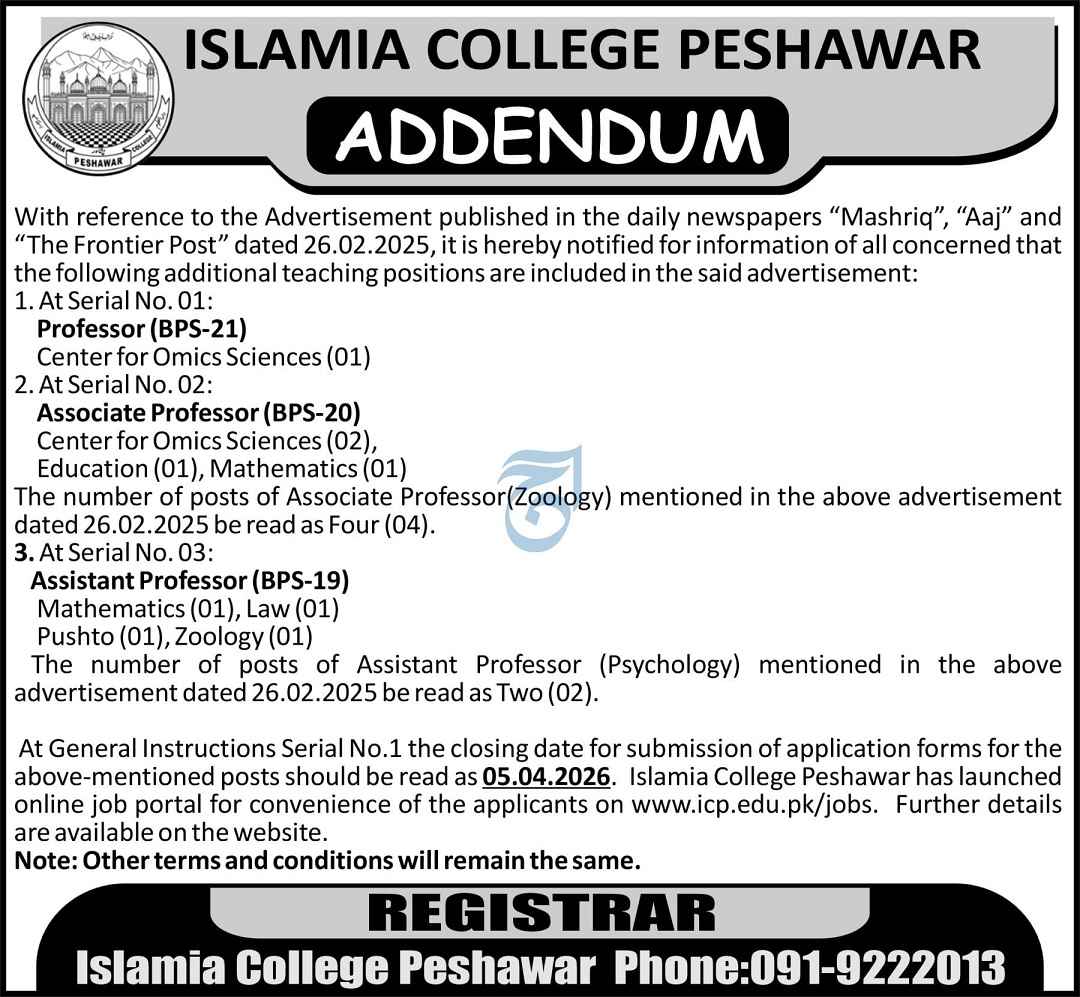 Advertisement of Islamia College Peshawar Jobs 2026 Apply Online for Teaching Faculty-296365