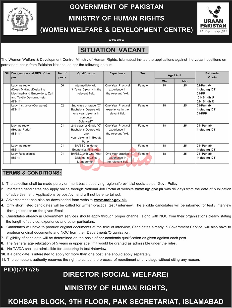 Advertisement of Ministry of Human Rights Jobs 2026 Apply Online for Women Welfare & Development Centre Islamabad-296369