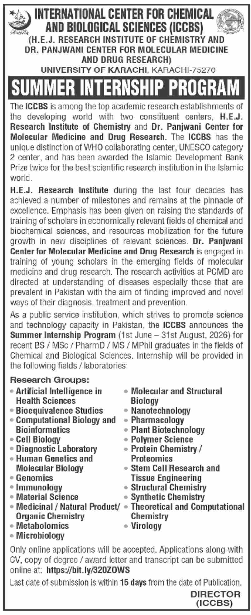 Advertisement of ICCBS Summer Internship Program 2026 Apply Online University of Karachi-296372