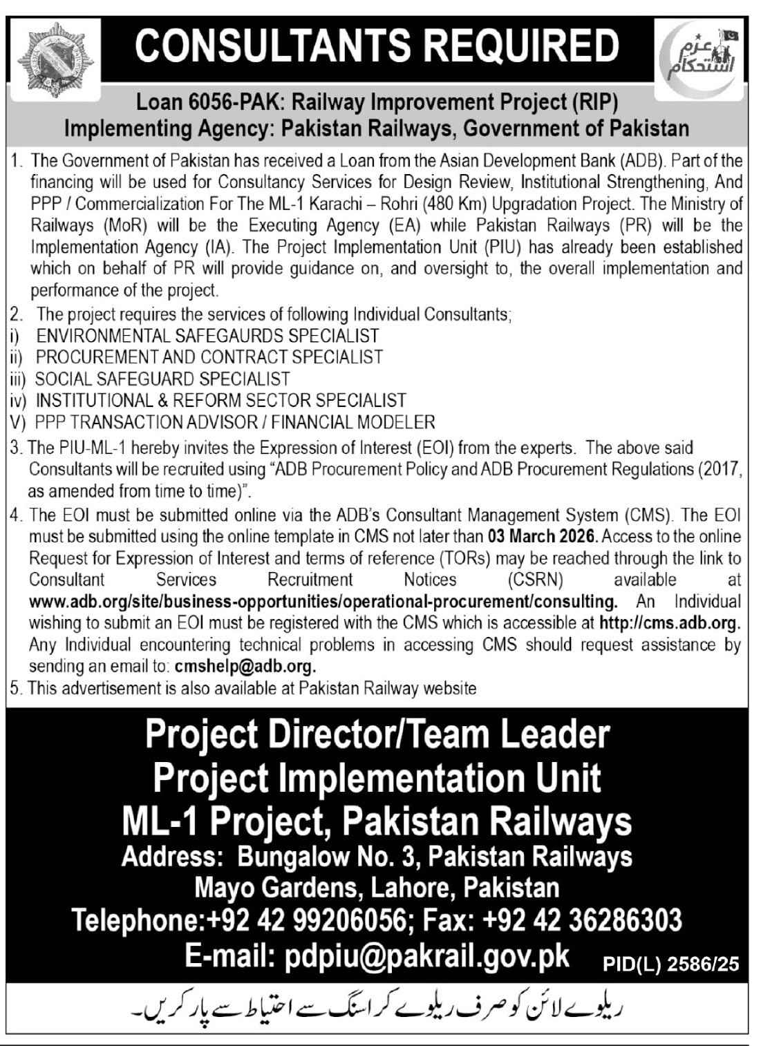 Advertisement of Pakistan Railways ML-1 Project Jobs 2026 for Consultants (ADB Funded) Apply Online -296376
