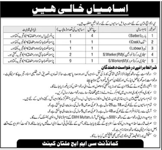 Advertisement of CMH Multan Cantt Jobs 2026 for Sanitary Workers, Laborer's, Cook & Barber-296399
