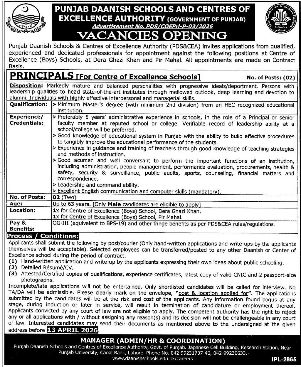 Punjab Daanish Schools & Centres of Excellence Authority Jobs 2026 for Principals PDS&CEA Job Ad shown on this page is taken from Express Newspaper on 23-03-2026