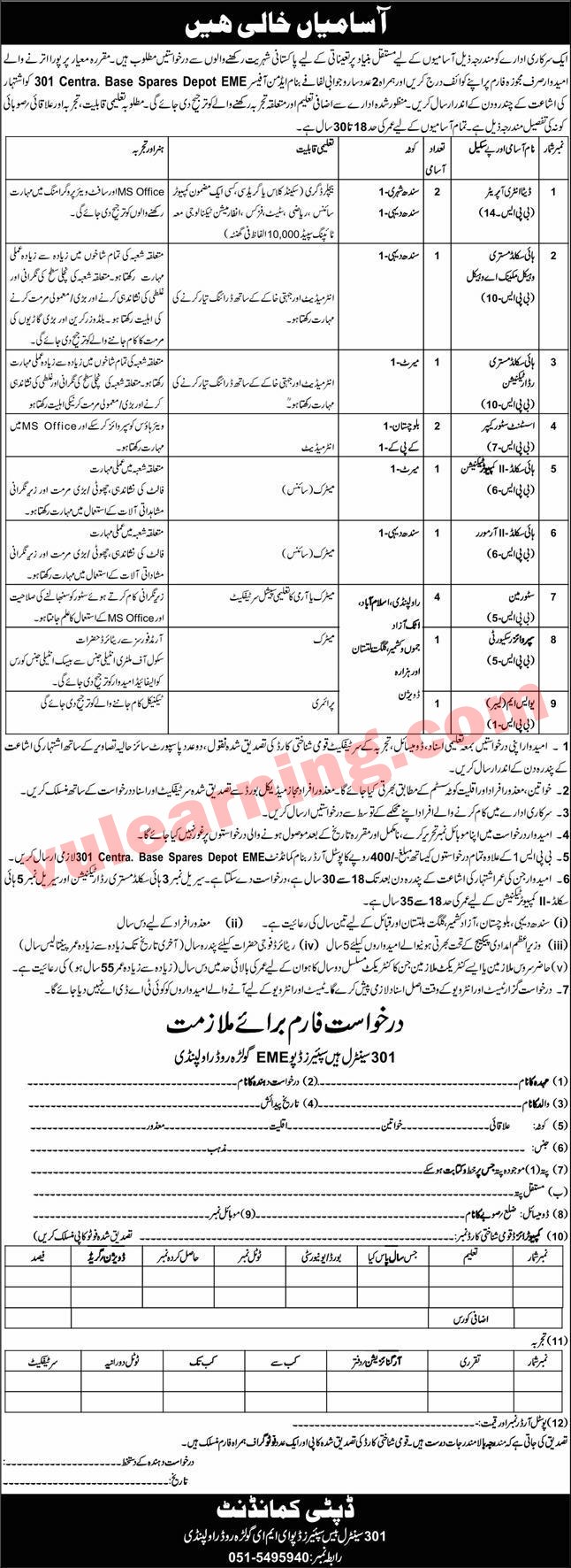Advertisement of Pak Army 301 Central Base Spares Depot EME Rawalpindi Jobs 2026 for Data Entry Operators, Storemen & Others-296401