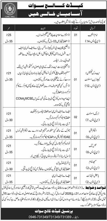 Advertisement of Cadet College Swat Jobs 2026 for Electrician, Cook, Khateeb, Khadim & Others-296405