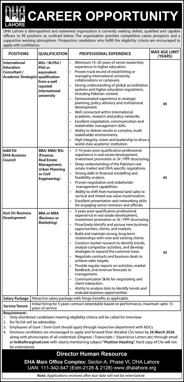 Advertisement of Defence Housing Authority DHA Lahore Jobs 2026 for Assistant Director, Additional Director & Education Consultant-296413