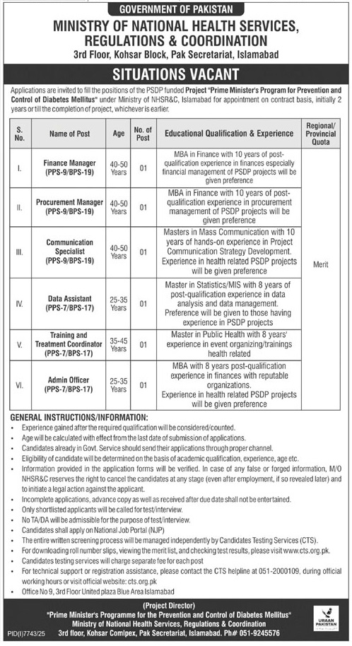 Advertisement of Prime Minister’s Program for Diabetes Control Islamabad Jobs 2026 Apply Online MoNHSR&C -296426