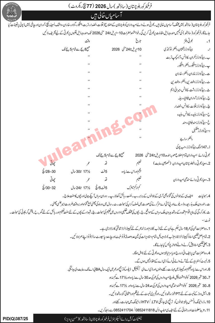 Advertisement of Frontier Corps FC Balochistan (South) Jobs 2026 77th Batch Recruitment Schedule Advertisement-296428
