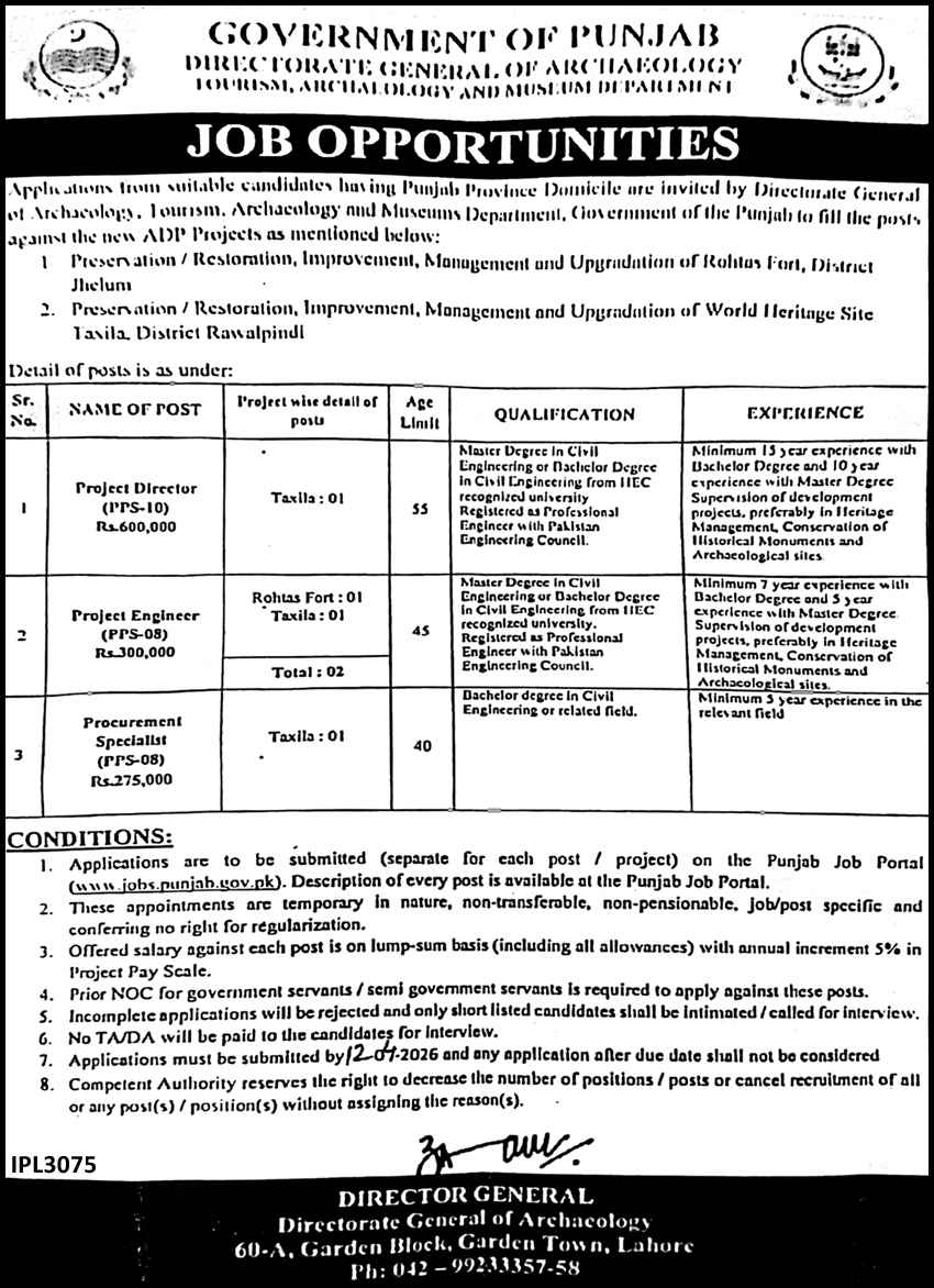 Advertisement of Directorate General of Archaeology Punjab Jobs 2026 Apply Online Tourism, Archaeology, and Museum Department-296429