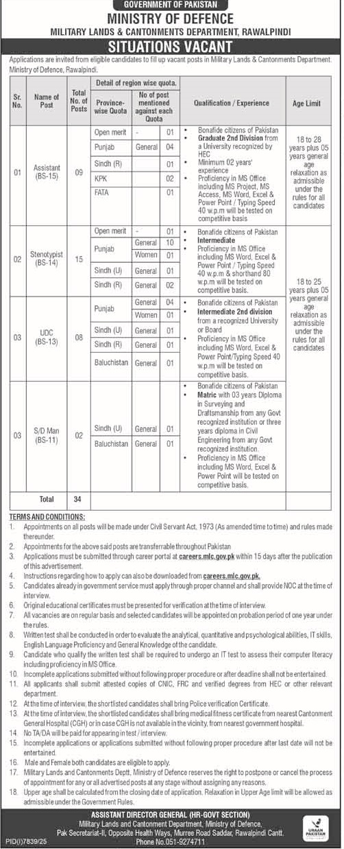 Advertisement of Military Lands & Cantonments Department Jobs 2026 Apply Online for Assistants, Steno-typists, Clerks & Others-296432