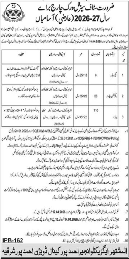 Irrigation Department Punjab Jobs 2026 for Ahmedpur East Canal Division Seasonal Work Charge Staff Job Ad shown on this page is taken from Khabrain Newspaper on 28-03-2026