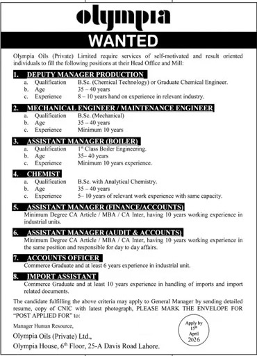 Advertisement of Olympia Oils Lahore Jobs 2026 for Assistant Managers, Engineers & Others-296460