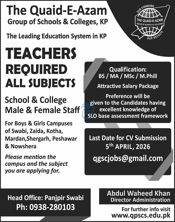 The Quaid-E-Azam Group of Schools & Colleges KP Jobs 2026 for Teachers Job Ad shown on this page is taken from Aaj Newspaper on 29-03-2026