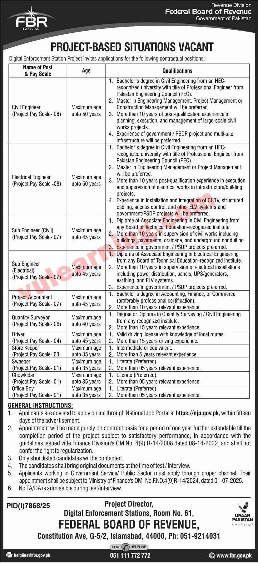 Advertisement of FBR Jobs 2026 Apply Online for Engineers, Sub Engineers, Drivers, Office Boy, Store Keeper, Chowkidar & Others Federal Board of Revenue -296475