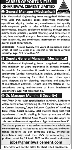 Gharibwal Cement Limited Jobs 2026 for Engineers & Managers PAIDAR CEMENT Job Ad shown on this page is taken from Jang Newspaper on 31-03-2026