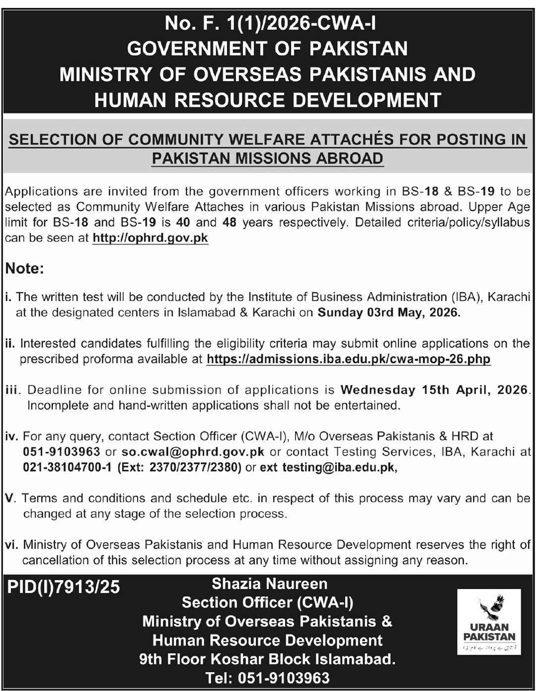 Ministry of Overseas Pakistanis and Human Resource Development Jobs 2026 for Community Welfare Attachés Job Ad shown on this page is taken from Jang Newspaper on 31-03-2026