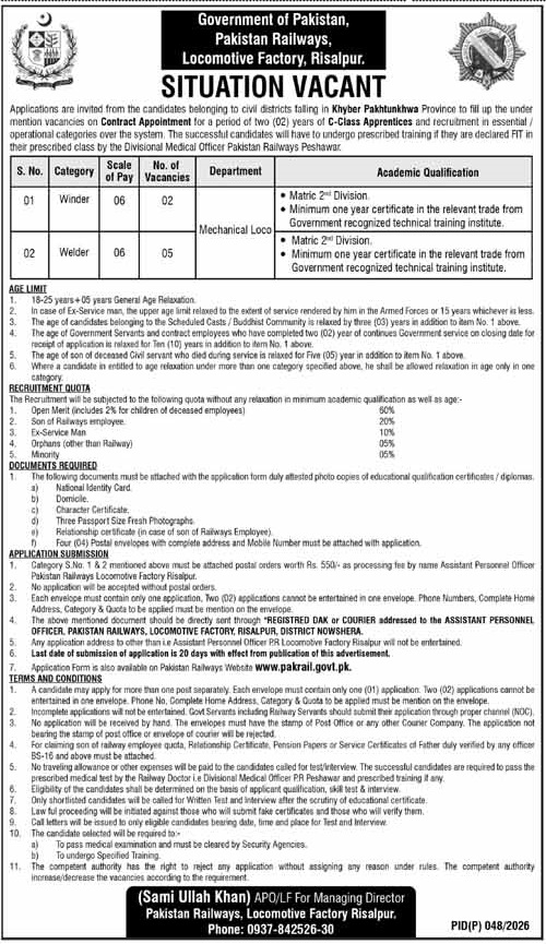 Pakistan Railways Jobs 2026 for Welders & Winders at Locomotive Factory Risalpur Job Ad shown on this page is taken from The News Newspaper on 27-03-2026