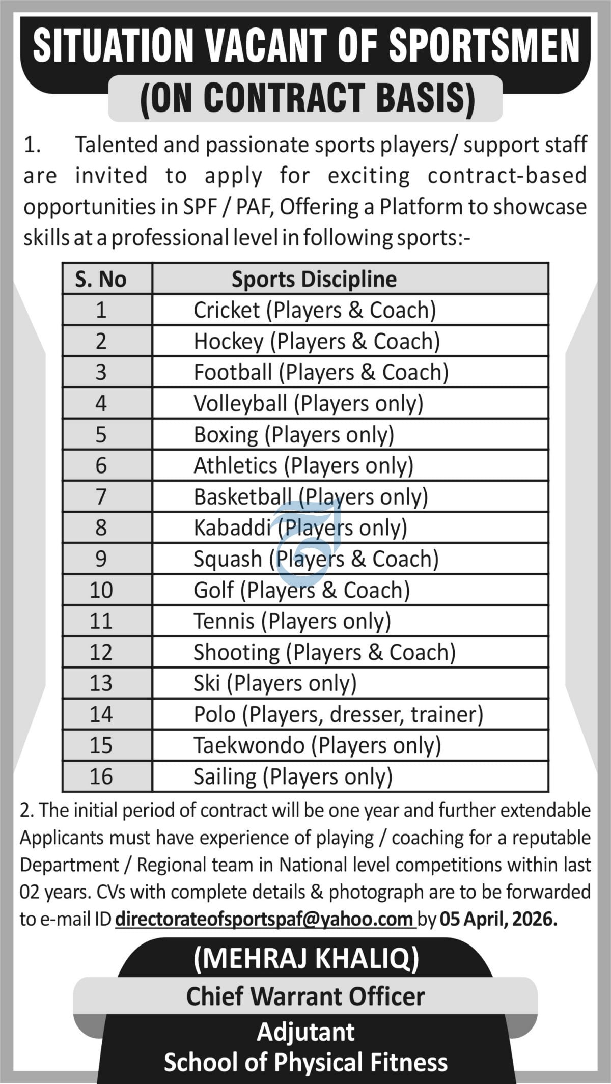 Advertisement of School of Physical Fitness (SPF) Pakistan Air Force PAF Jobs 2026 for Coaches & Players-296497