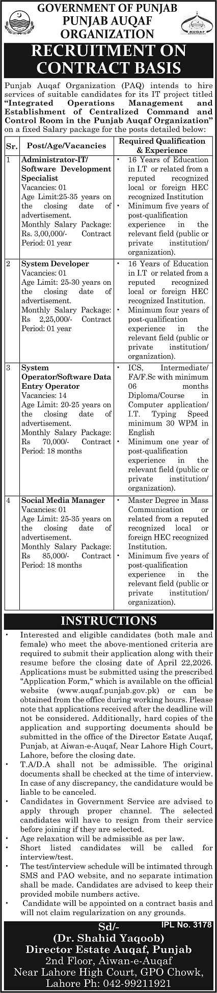 Advertisement of Punjab Auqaf Organization Jobs 2026 for Data Entry Operators & Others PAQ-296508