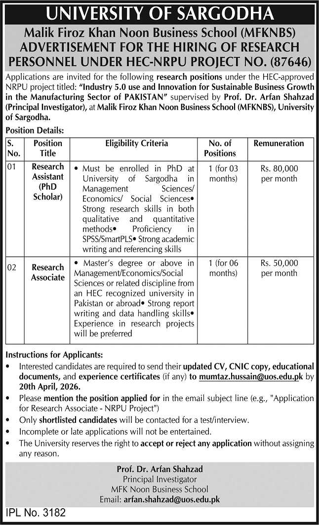University of Sargodha UOS Jobs 2026 Research Assistant & Research Associate Job Ad shown on this page is taken from Express Newspaper on 02-04-2026
