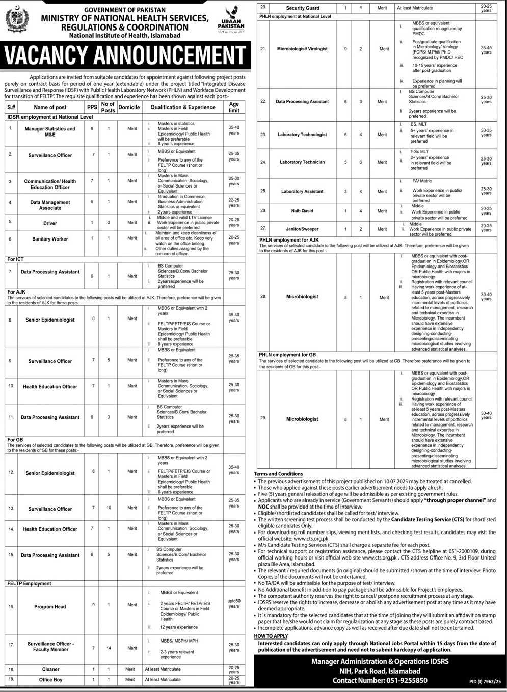 Advertisement of Ministry of National Health Services (NIH) Islamabad Jobs 2026 Apply Online-296523