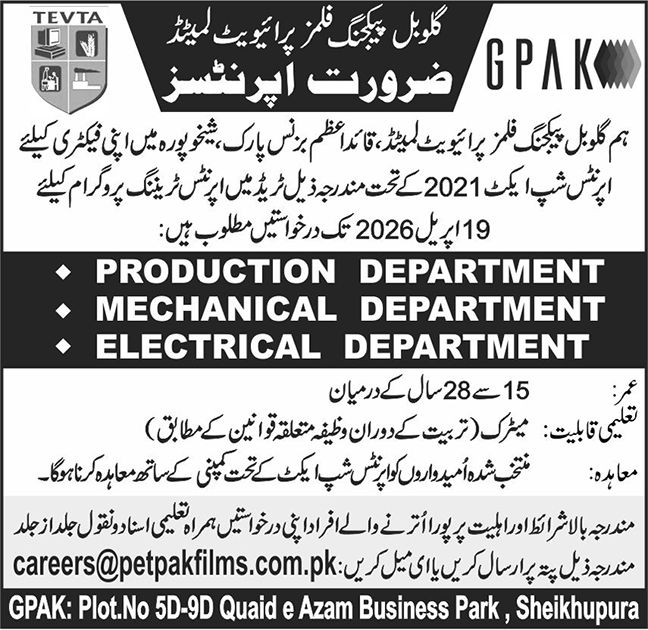 Advertisement of Global Packaging Films Pvt Ltd Sheikhupura Apprenticeships 2026 GPAK TEVTA Apprentices Jobs Latest-296548