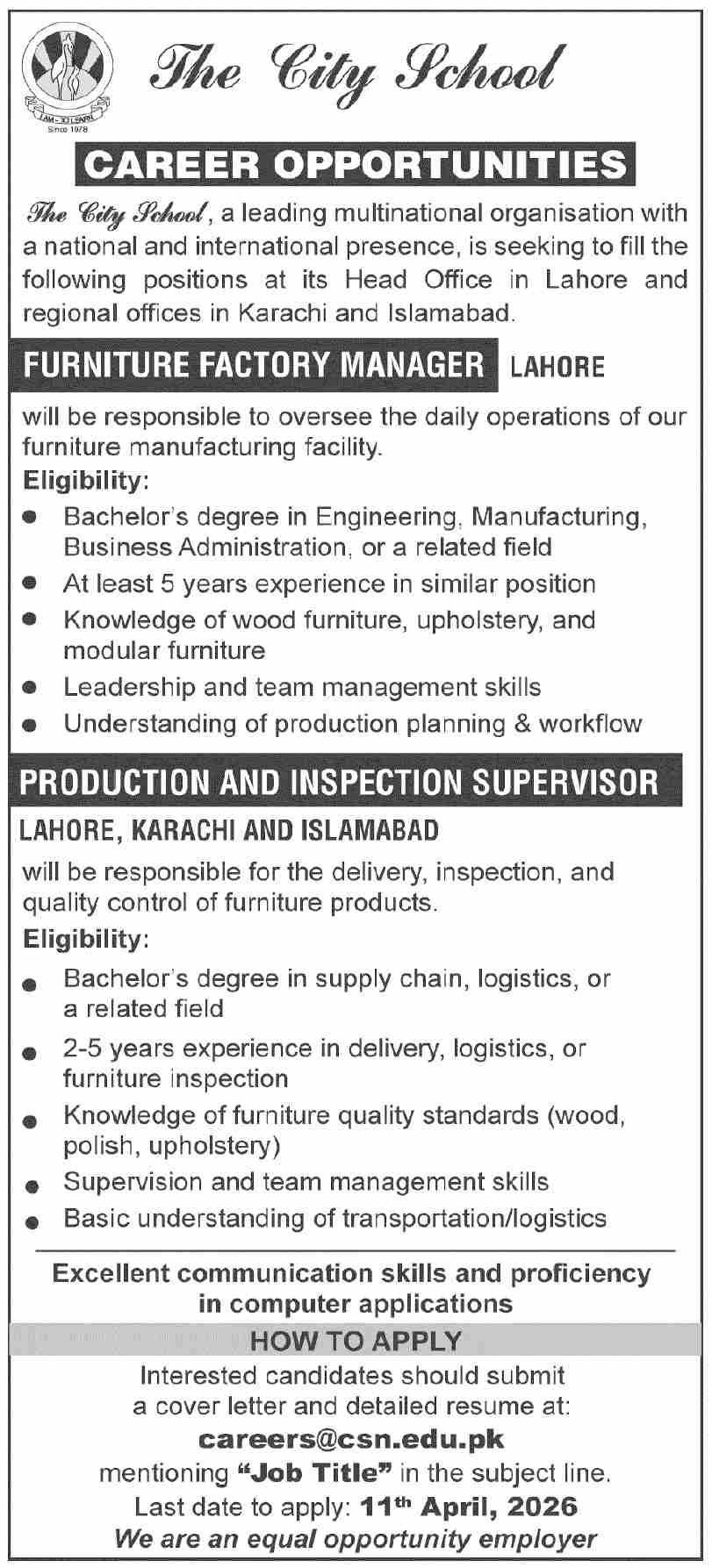 The City School Jobs 2026 for Lahore, Karachi & Islamabad Apply Online Job Ad shown on this page is taken from Dawn Newspaper on 05-04-2026