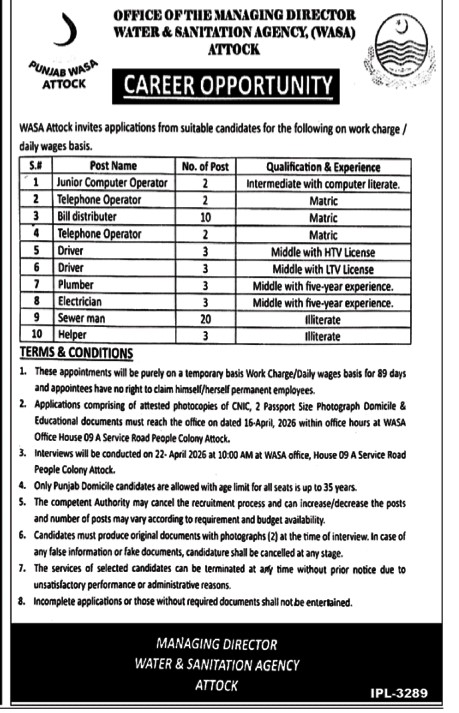 WASA Attock Jobs 2026 for Bill Distributors, Jr Computer Operators, Drivers, Plumbers & Others Job Ad shown on this page is taken from Jang Newspaper on 06-04-2026