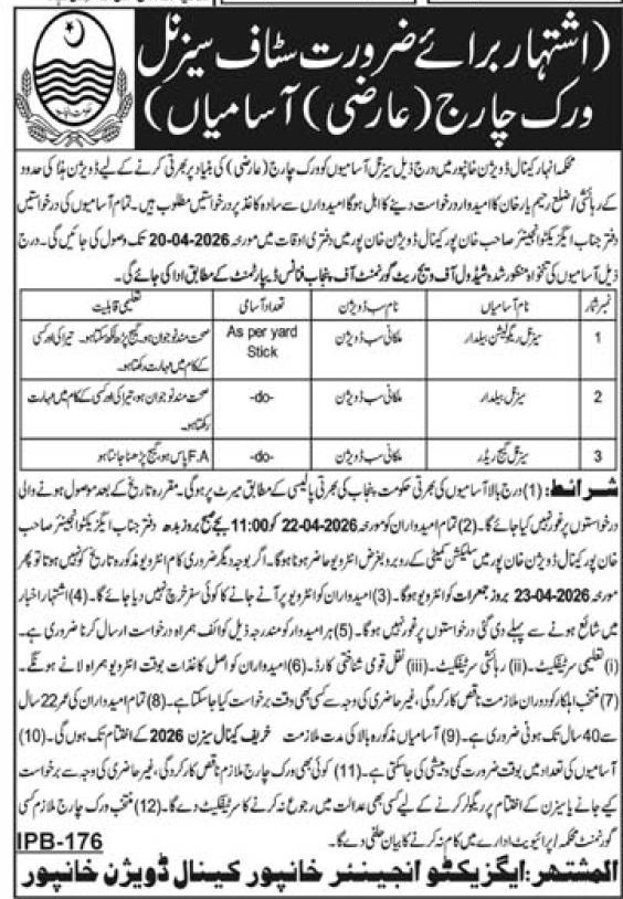 Irrigation Department Khanpur Jobs 2026: Seasonal Work Charge Positions Job Ad shown on this page is taken from Khabrain Newspaper on 07-04-2026