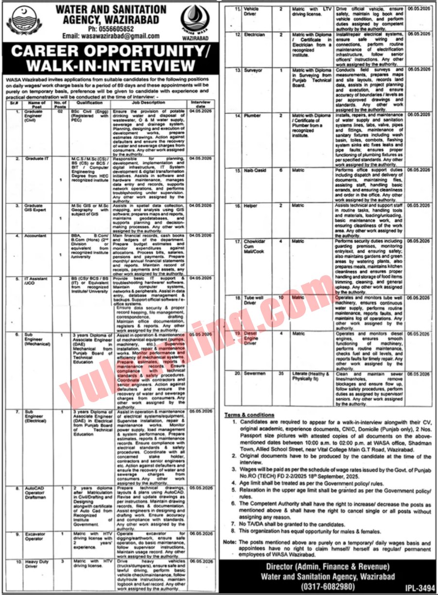 WASA Wazirabad Jobs 2026 for Drivers, Naib Qasid, Chowkidar, Sewerman & Others Walk-In-Interviews Job Ad shown on this page is taken from Dunya Newspaper on 10-04-2026